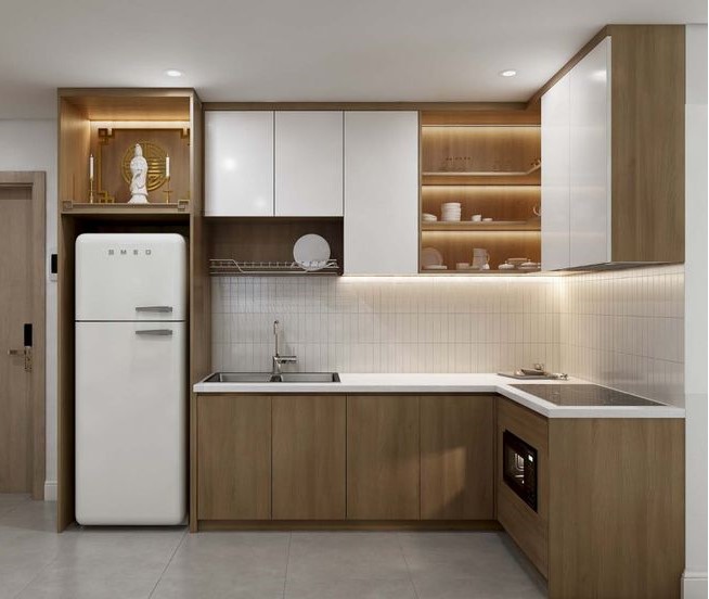 Bố trí bếp hợp lý, tiết kiệm diện tích giúp không gian nấu nướng trở nên gọn gàng, tiện lợi và thoáng đãng hơn. Hãy ưu tiên sử dụng tủ bếp kịch trần để tận dụng tối đa không gian lưu trữ, đồng thời chọn kệ treo tường hoặc móc treo thông minh để sắp xếp dụng cụ gọn gàng. Bố trí bàn ăn gấp gọn hoặc quầy bar mini giúp tiết kiệm diện tích mà vẫn đảm bảo tiện nghi. Ngoài ra, việc sắp xếp theo nguyên tắc “tam giác bếp” (bếp nấu – bồn rửa – tủ lạnh) sẽ giúp di chuyển dễ dàng và tối ưu công năng khi sử dụng.